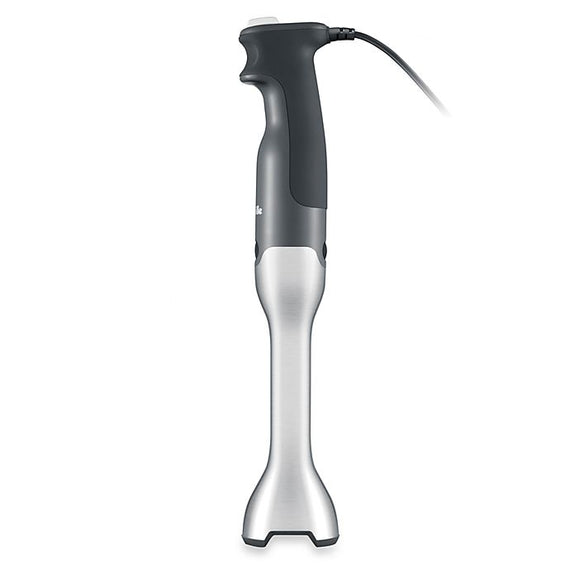 Hand-held immersion blender with bell shaped base and revolutionary shape plus internal ribbing reduces the suction for greater control and efficient blending. Ergonomic pistol-like control grip with trigger operation. 8in immersion depth for large quantities or tall pots. Adjustable Speed. Non-scratch base to prevent scratching pots.