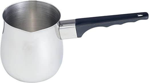 Fino's Stainless Steel Turkish Warmer easily makes and serves traditional Turkish-style coffee. It's ideal for warming milk for the creamiest of hot-beverage creations. It's crafted from professional-quality 18/8 stainless steel to avoid hot spots so contents are warmed gently and evenly with less scorching. It's extra durable for long-term daily use. Specially designed for stovetop use, including gas, electric and induction, it features a longer contoured handle that's heat resistant and super comfortable to hold. With a drip-free spout, pouring contents is effortless and controlled without the mess. Easily create everyday beverages or entertain guests for the holidays. Make traditional Turkish coffee, hot chocolate, or warmed milk and honey, melt butter for baking, dipping seafood, or topping movie-night popcorn, warm milk or cream, tea, sauce, gravy, and more. It's a helpful addition to specialty coffee accessories for frothing steamed milk with an espresso maker, and perfect for baking, party food preparation supplies, and bar tools. Made from professional quality 18/8 stainless steel with ABS plastic handle, Fino's Stainless Steel Turkish Warmer is sturdy and durable for long-term use. Hand wash in warm, soapy water. Brought to you by HIC, a third-generation family owned and operated company in the USA since 1957.