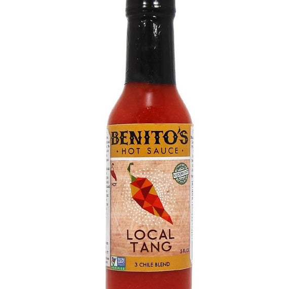 HOT! 1st Place Winner at the 2013 Hot Pepper Awards in NYC!!! The local Tang is a fresh blend of fatali, habanero, and paper lantern peppers (UVM Catamount Farm- South Burlington, VT). Benito’s also add fresh onions , garlic and carrots to give this 3 chile blend a solid amount of death. This sauce is highly addictive! It has a sensational fresh vegetable flavor without the sodium, gums and starches of course!