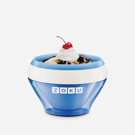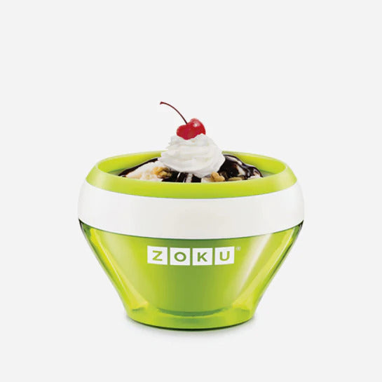 Make individual portions of ice cream, custard, frozen yogurt, gelato, sorbet, or sherbet in as little as 10 minutes with the Zoku Ice Cream Maker! Whether you prefer classic flavors like vanilla bean, mint chocolate chip, fresh strawberry, or dark fudge, or you like to create your own flavors, fresh ice cream can now be a spur-of-the-moment decision. Top your creation with fruit, candy pieces, nuts, or brownie chunks, and for a classic flourish, add a bright red cherry on top.
