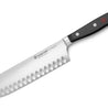 The Japanese vegetable knife: extremely versatile and suitable for tasks such as cutting, dicing or chopping. Its shape is reminiscent of a cleaver but should not be confused with it as a Nakiri is not suitable for rough tasks (such as splitting bones). The very sharp and finely ground blade is more designed to prep vegetables, herbs and fruit very quickly and finely. The dimpled edge of the knife (slight depressions in the blade that allow small pockets of air to form) prevents ingredients from sticking.