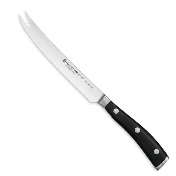 The CLASSIC IKON 5” Tomato Knife has a serrated edge that enables the blade to slice through tomatoes without damaging the delicate fruit inside. The fork tip is ideal for picking up the thinly sliced produce for serving. Much like a serrated utility knife, the tomato knife could also be used to cut citrus fruits or other small fruits and vegetables.