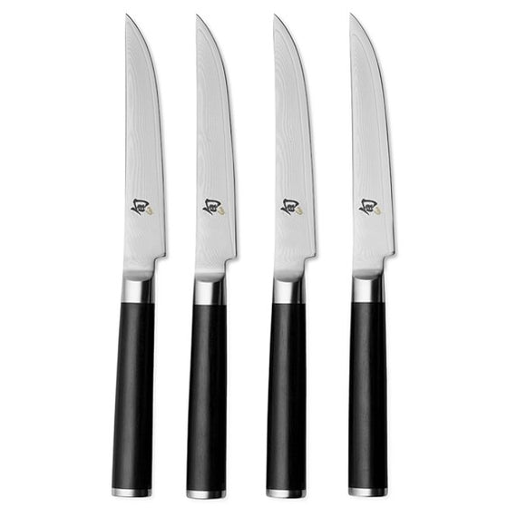 The right steak knife can make a good steak taste even better. The key is in keeping more of the flavorful juices inside the steak. A razor-sharp knife, like the Shun Premier Steak Knife, will glide through the meat, cutting fewer of the capillaries in the steak and keeping more of the flavor inside, where it belongs. This set of four beautiful Shun Premier Steak Knives are a perfect five-inch length; long enough to handle even the largest steak, yet short enough to provide excellent cutting control. This four-piece set is ideal for a small dinner party. The Shun Premier Steak Knife Set comes in an elegant box, perfect for gift giving or storage.