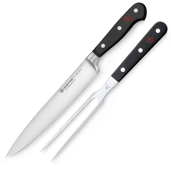 Made in Germany, this set is perfect for carving the holiday bird or any meat or poultry. The knife's high-carbon-steel blade slices cleanly without tearing. The sturdy carving fork holds meat securely in place.