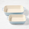 • The stackable 2-pack rectangular dishes measure 7.5"" x 6"" and 10.5"" x 7.5"" and are perfect for lasagna, casseroles, desserts, as well as roasted meats and vegetables, and transition beautifully from oven to table.