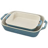 Staub rectangular stoneware bakers gently retain heat and won't absorb moisture, producing a delicious result for all of your favorite dishes. The stackable 2-pack rectangular dishes measure 7.5" x 6" and 10.5" x 7.5" and are perfect for lasagna, casseroles, desserts, as well as roasted meats and vegetables, and transition beautifully from oven to table.