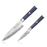 A starter knife set almost too stunning to use. Hand-sharpened by highly skilled artisans, the full-tang X-7 steel blades ripple with a beautifully hammered surface that encourages sliced foods to slide right off. Faux wood grain in blue and black streaks the lightweight and durable octagonal handles, each secured with a single mosaic rivet as a luxurious finishing touch. Presented in a wooden box, the exceptionally sharp 3.5-inch paring knife and 6-inch chef knife make a sensational wedding, graduation or housewarming gift.