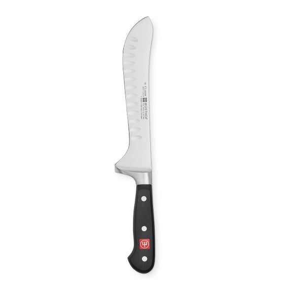 The CLASSIC 8-inch Artisan Butcher Knife features a striking silhouette with a contoured finger guard, a dramatic curved hollow-edge blade and a pronounced skinning tip. This bold statement piece is far more versatile than the traditional butcher knife, perfectly designed for portioning chops and steaks and trimming cutlets and filets. The ideal size and shape for countless food prep tasks, the CLASSIC 8-inch Artisan Butcher Knife is perfectly balanced with a comfortable over-sized handle. Its razor sharp edge effortlessly skins and slices large fruits and vegetables. It’s as functional as it is handsome.