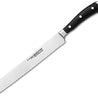 The CLASSIC IKON 8"" Bread Knife slices through bread or baguettes with minimal crumbs. The serrations along the edge help guide the blade through tough crust without compressing the soft inside.