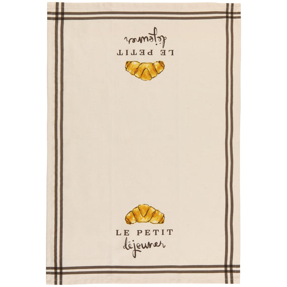 Add life and character to your kitchen with our fun and colorful printed and woven cotton Le Petit Dejeuner dishtowel. A perfect combination of form and function, this towel will make washing up less of a chore. Begin the day with a très chic breakfast: a buttery, flaky croissant and a strong espresso. This iconic crescent-shaped pastry brings the charm of a Parisian café to any kitchen.