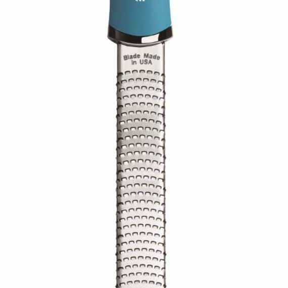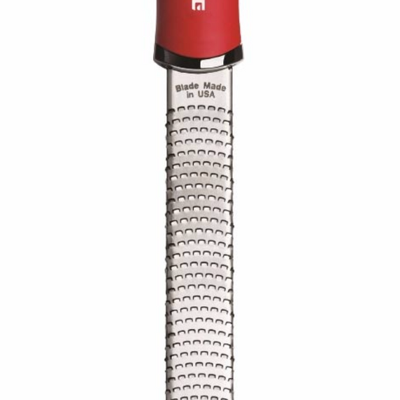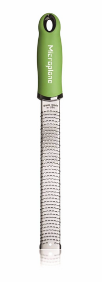 Updated handles for a Classic Zester This version of the classic Microplane zester/Cheese Grater has a premium soft-touch handle and non-scratch end tabs. This tool grates even the hardest Parmesan Reggiano as well as other hard cheeses into fine lacy wisps. Ideal for topping your favorite spaghetti and meatballs or a Caesar salad. It’s also wonderful for effortless citrus zesting to add natural flavors to a lemon crème brulee or a basic vinaigrette